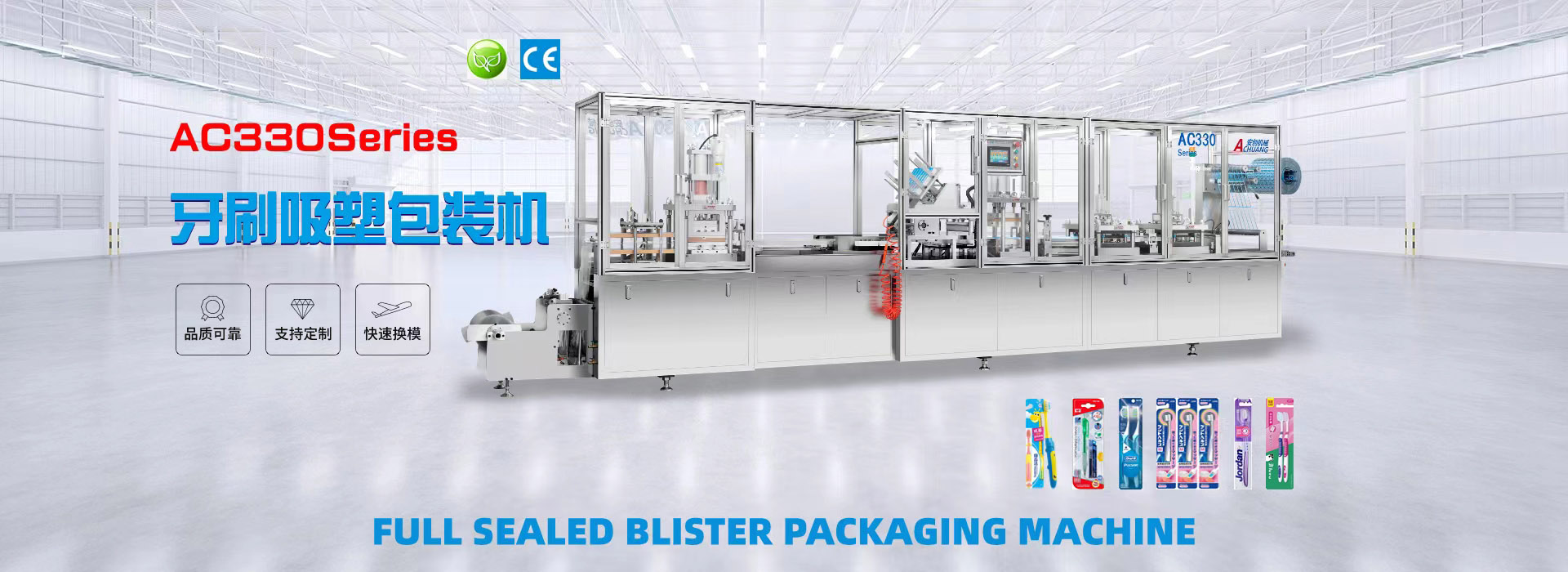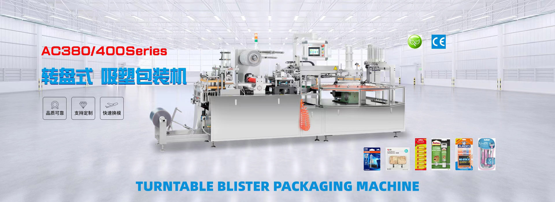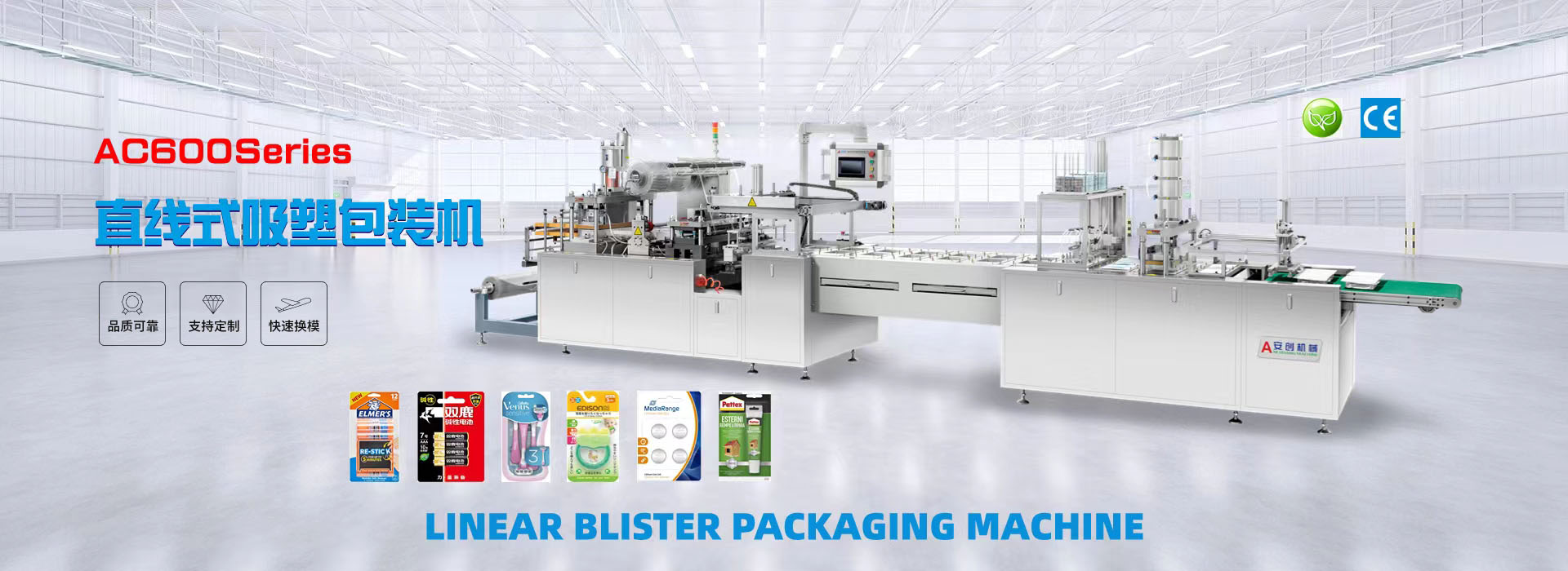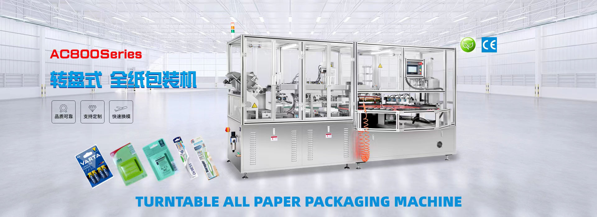我們專業(yè)生產(chǎn)全自動(dòng)紙塑(吸塑)包裝機(jī),牙刷吸塑包裝機(jī),電池掛卡包裝機(jī),自動(dòng)裝盒機(jī),紙吸管機(jī)等系列產(chǎn)品和多機(jī)智能聯(lián)動(dòng)生產(chǎn)線及其相關(guān)配套設(shè)備。公司集生產(chǎn)、研發(fā)、銷售、售后為一體的企業(yè)。該產(chǎn)品適用于小五金(堿性電池、紐扣電池、膠水)、文具(卷筆刀、橡皮擦、涂改液、固體膠)、汽摩配(剎車片,雨刮片)、日用品(剃須刀、牙刷、牙線)、化妝品(唇膏,指甲刀,香水)、藥品(紅花油、風(fēng)油精,)、玩具(小汽車,指尖陀螺,手表)、醫(yī)療器械、食品、等行業(yè)相關(guān)產(chǎn)品的紙塑包裝。